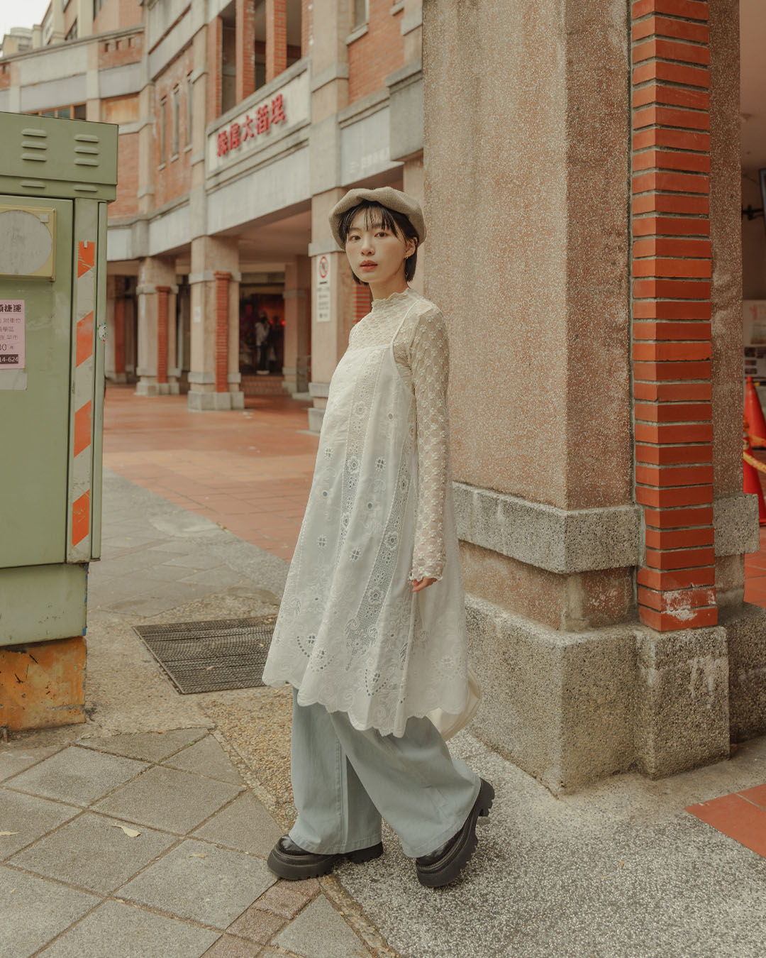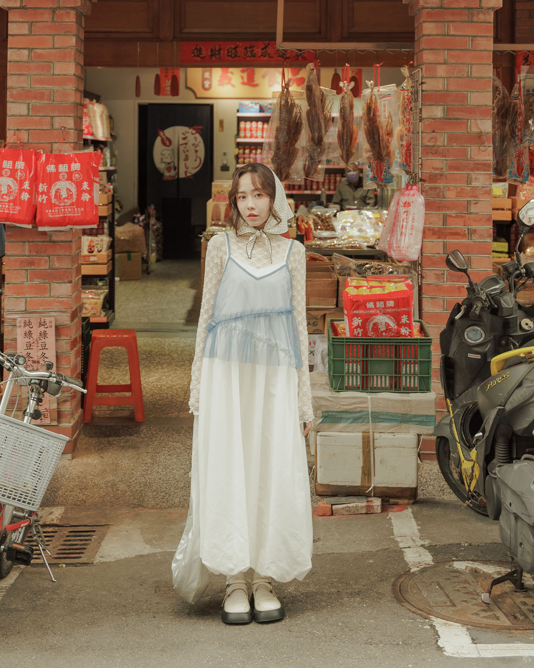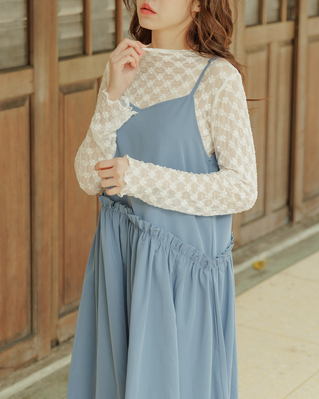 愛心緹花網紗細肩蛋糕長洋裝 三色售
