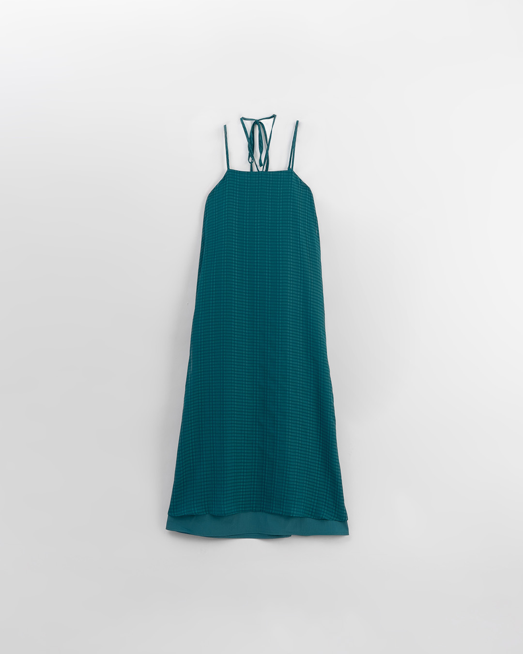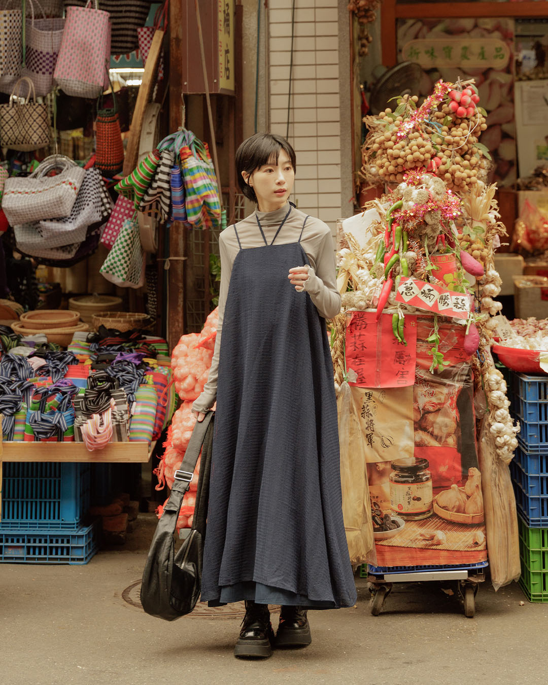 雙層透紗格紋細肩長洋裝附綁帶 兩色售