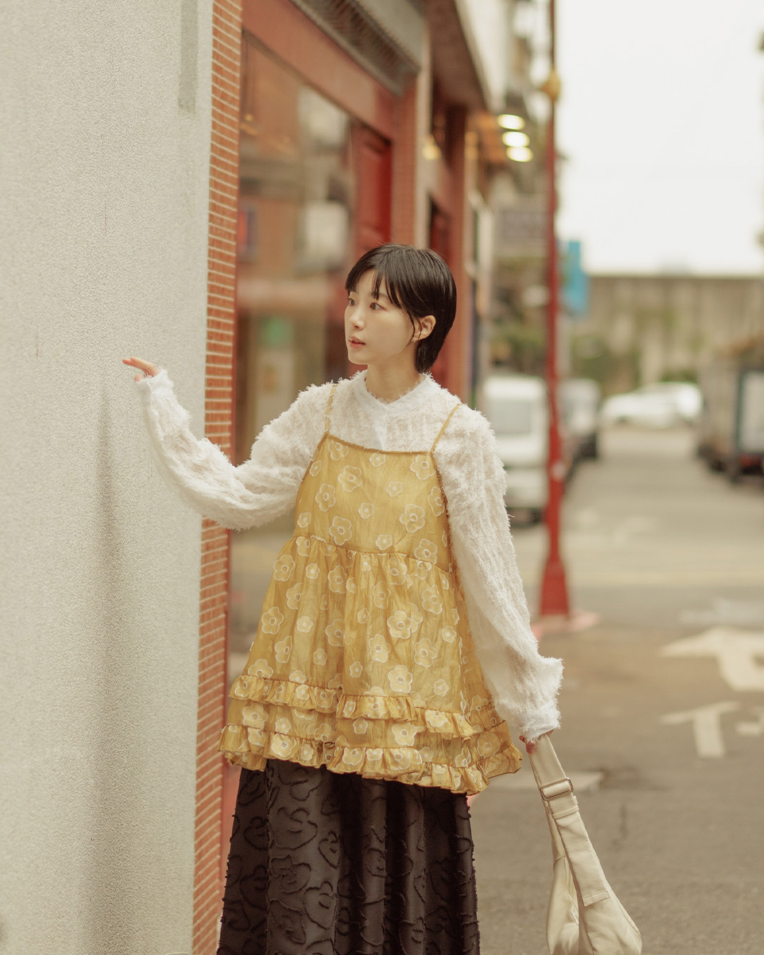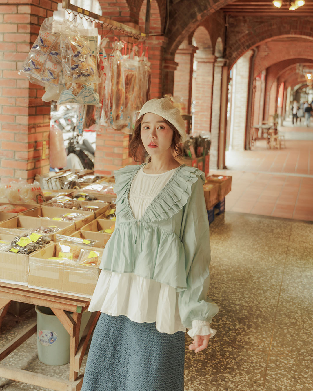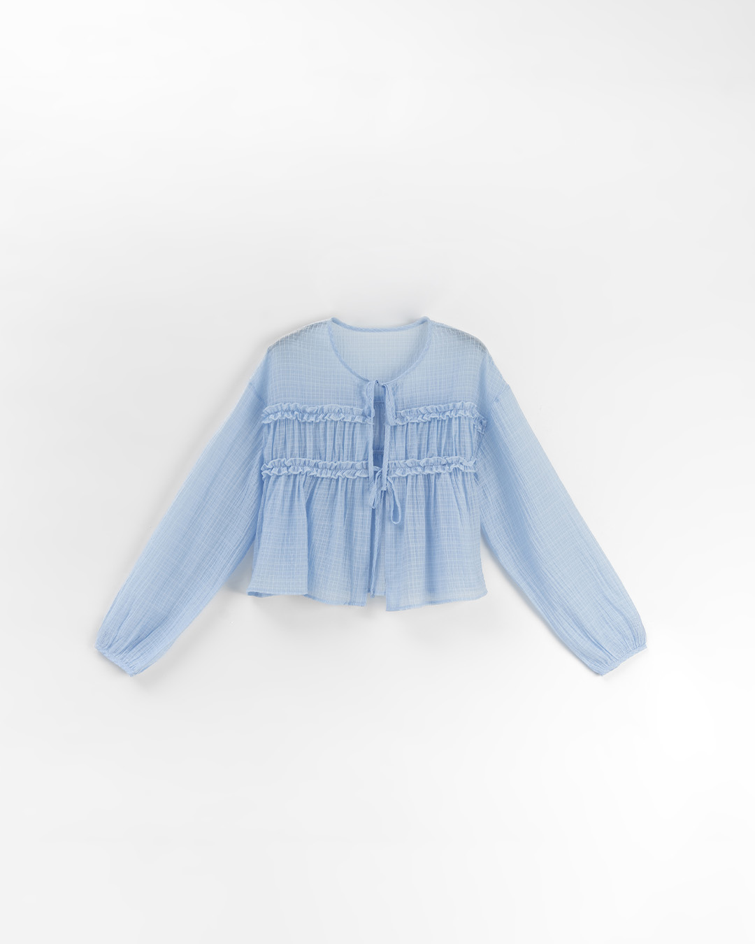 透膚織紋荷葉剪接綁帶罩衫 兩色售