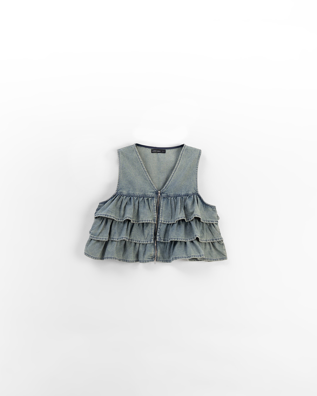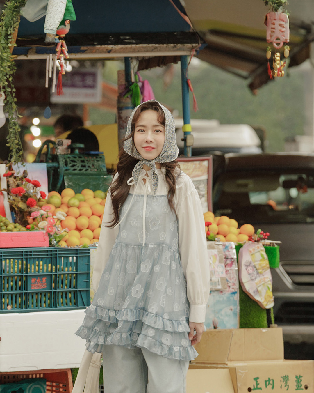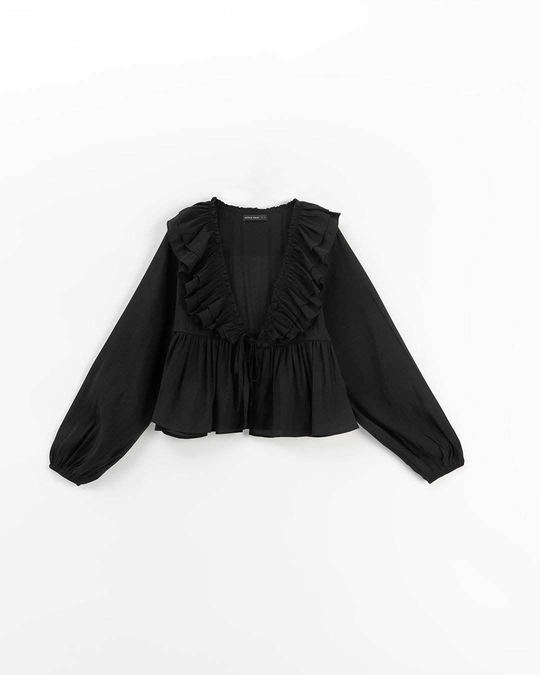 透膚織紋荷葉剪接綁帶罩衫 兩色售