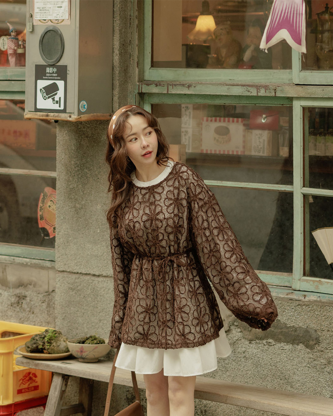 鏤空緹花造型附綁帶寬版上衣 兩色售