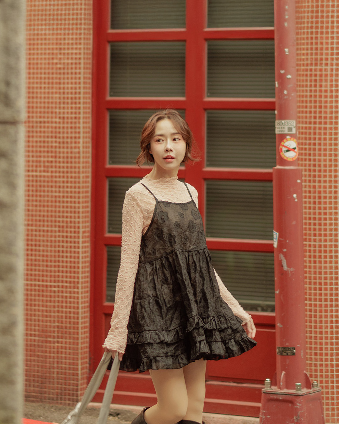 透紗背心荷葉剪接兩件式氣球長洋裝 三色售