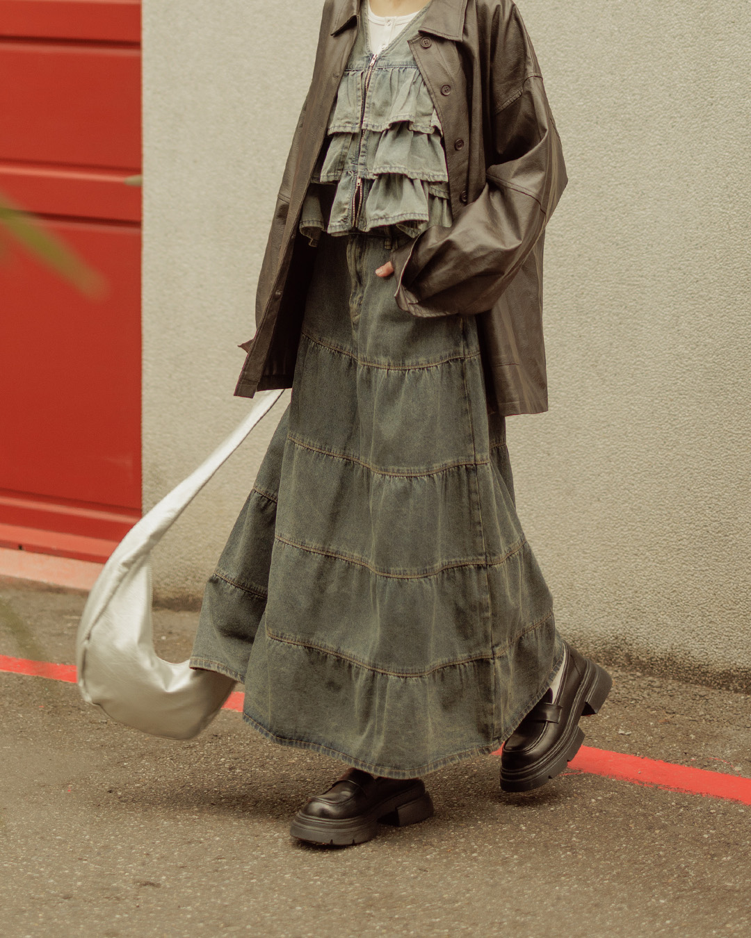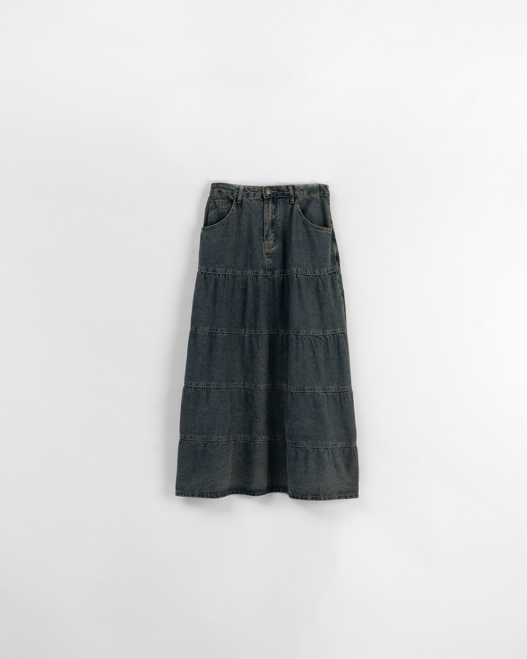 復古洗水蛋糕剪接造型牛仔裙 S/M/L