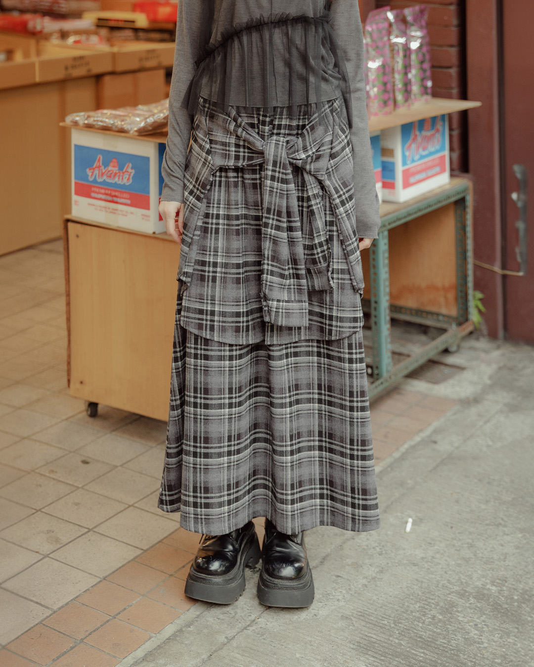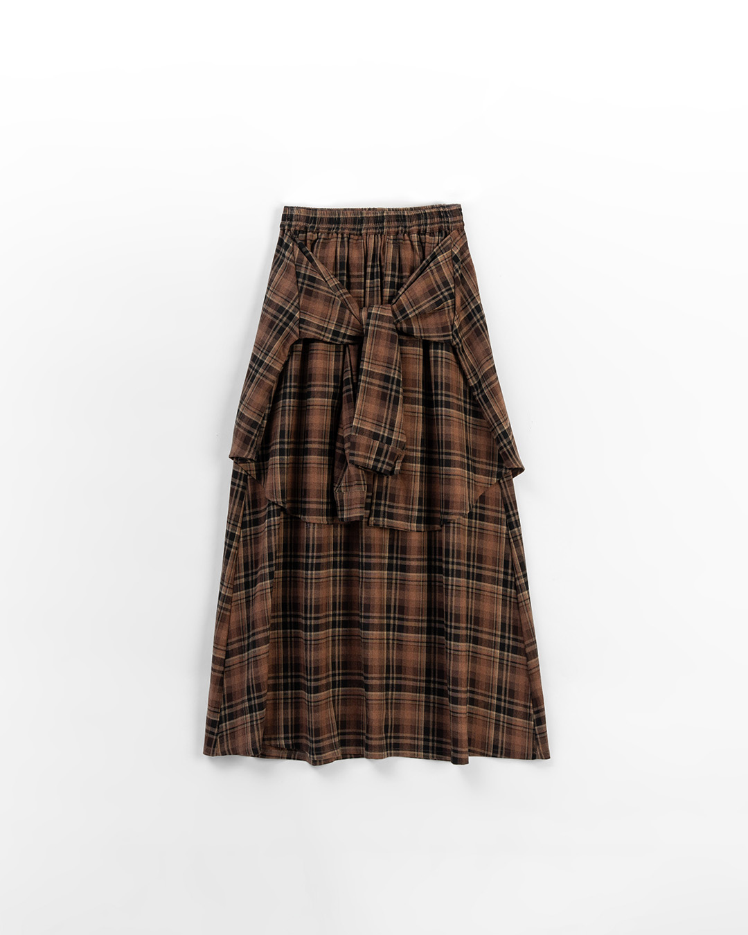 格紋磨毛襯衫綁腰假兩件長裙 兩色售