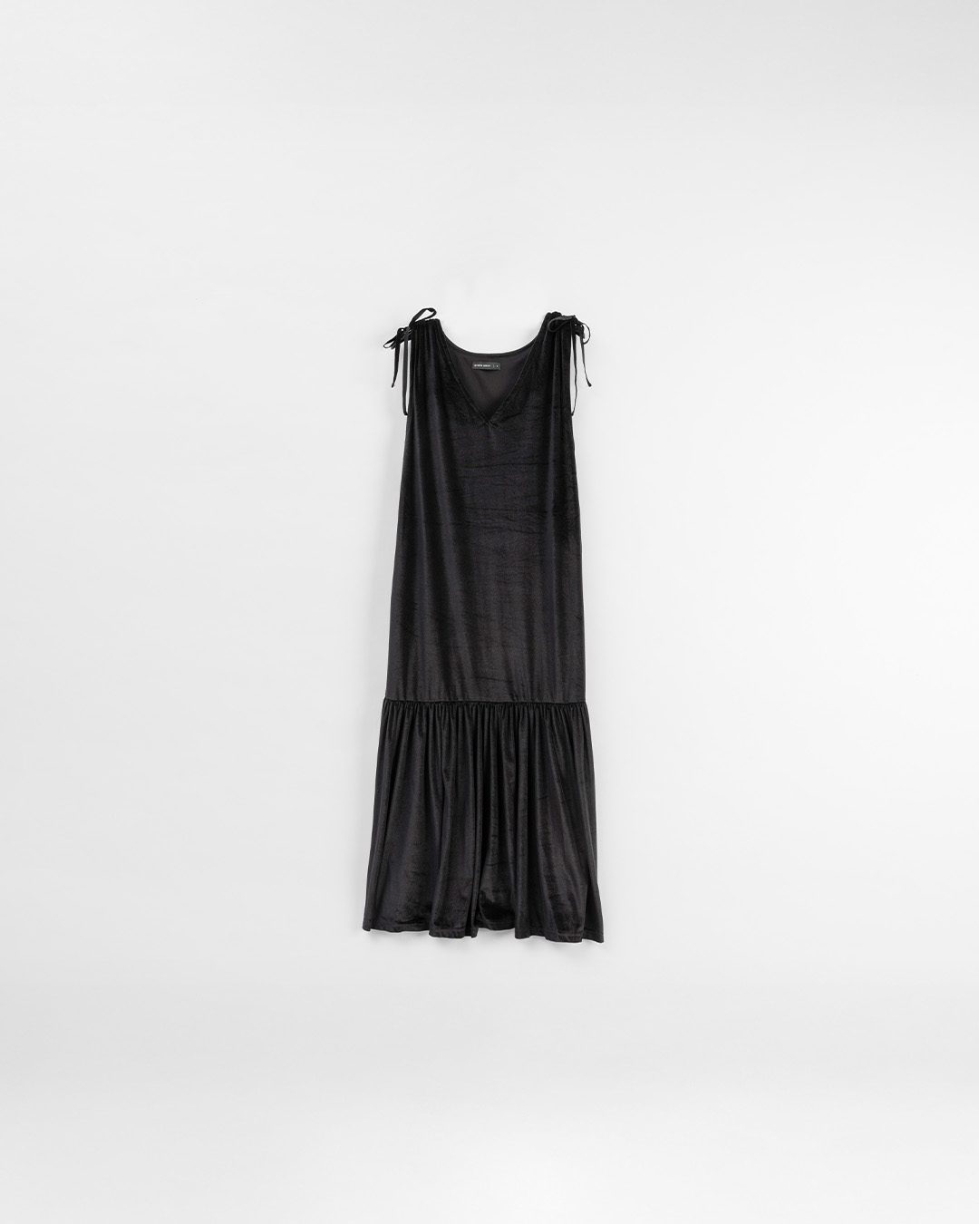 微光澤絨面V領肩綁帶長洋裝 兩色售
