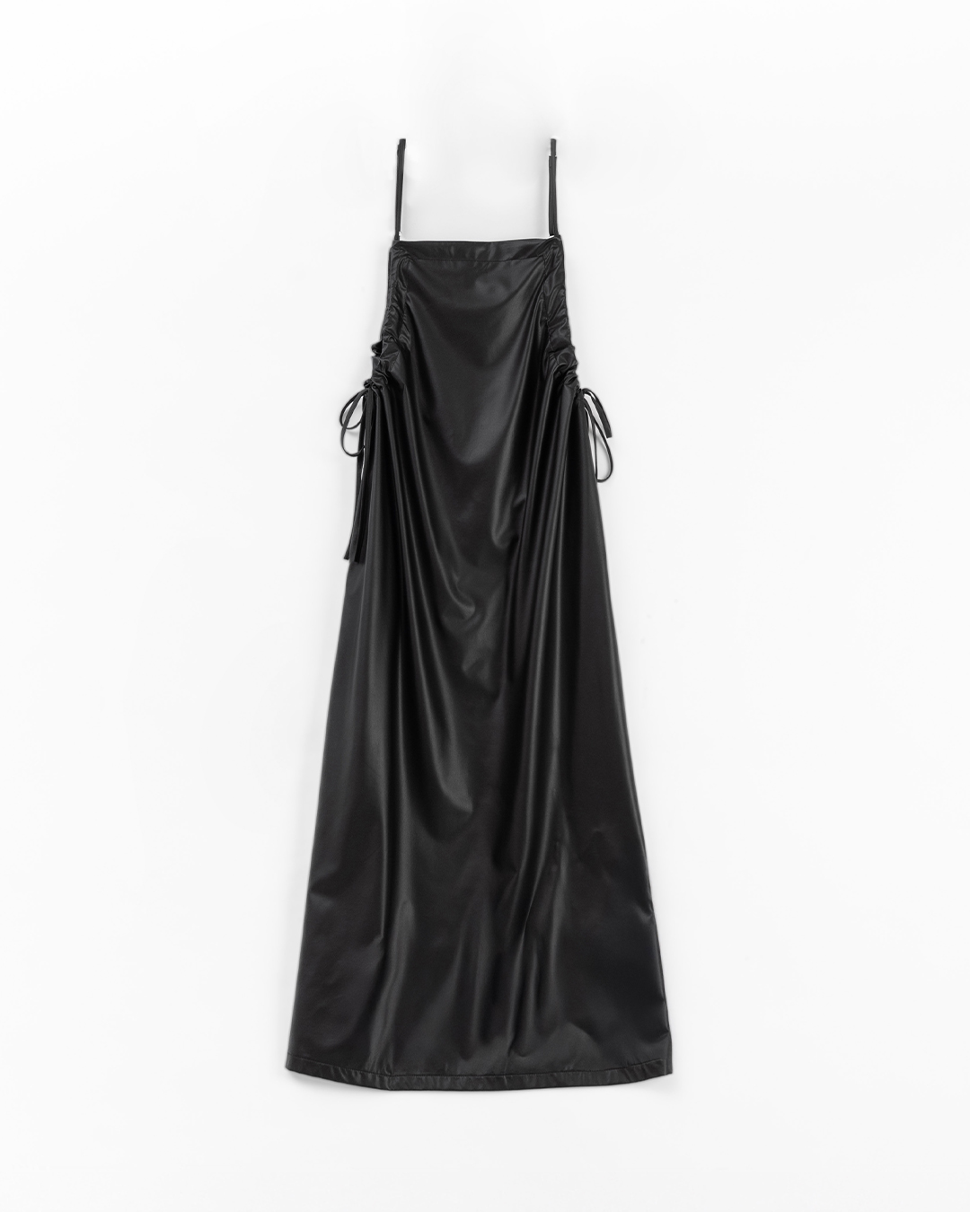 質感側抽皺綁帶細肩皮洋裝 兩色售