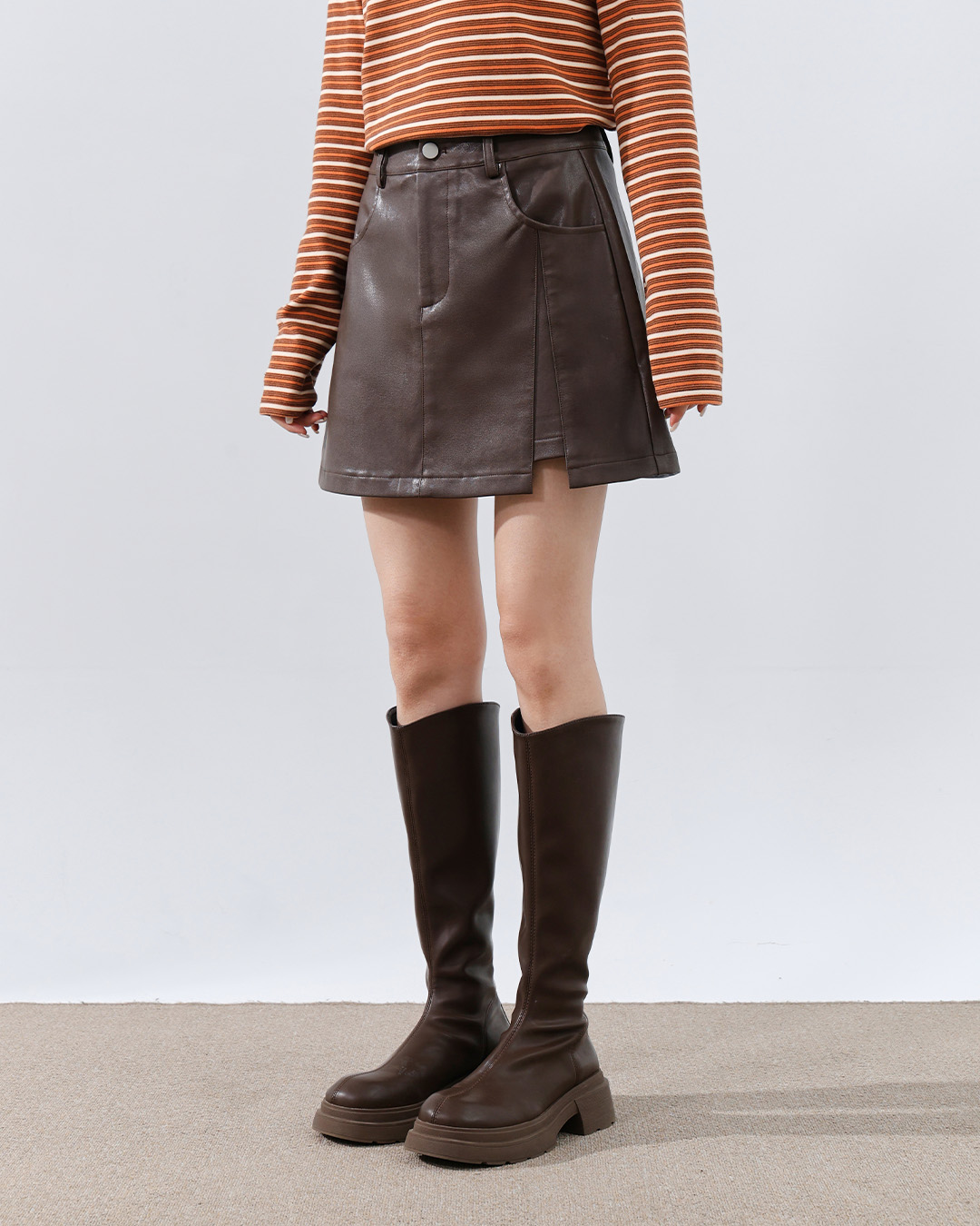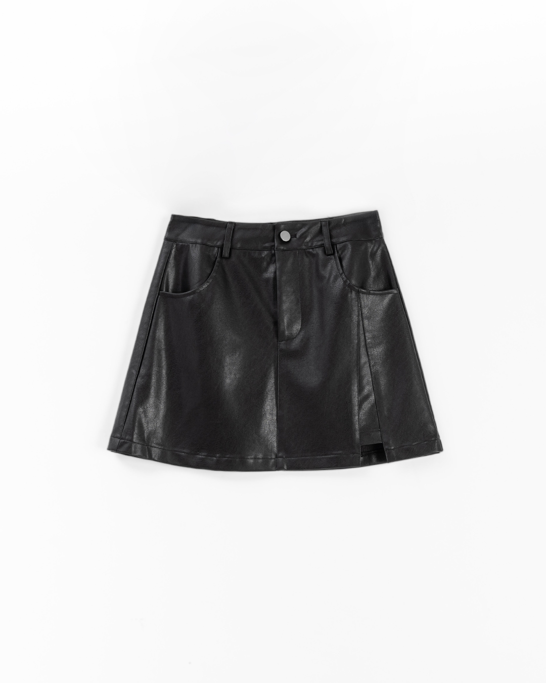 開衩剪接設計皮革短裙 兩色售 S/M/L