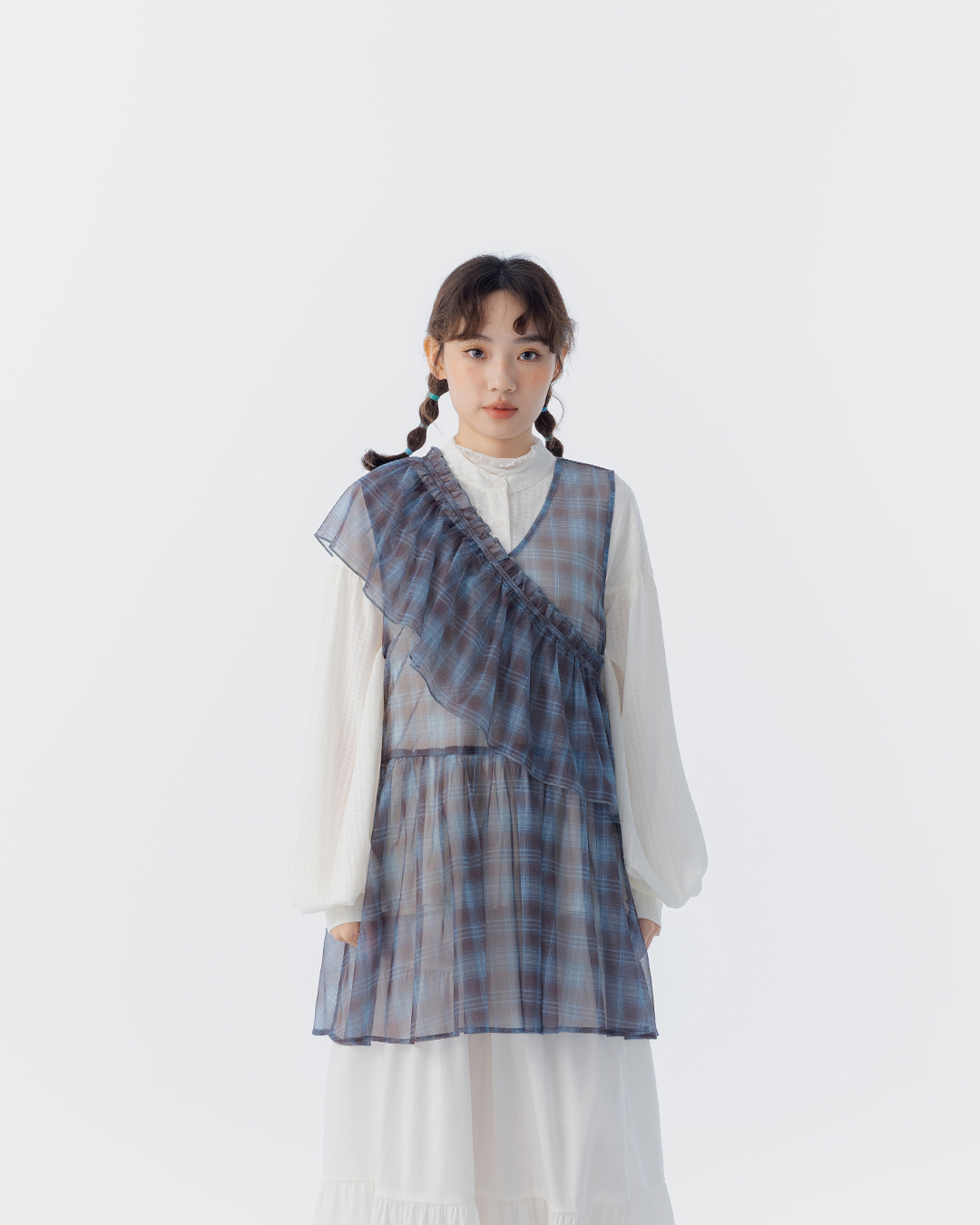 雙層格紋透紗荷葉造型背心洋裝 兩色售