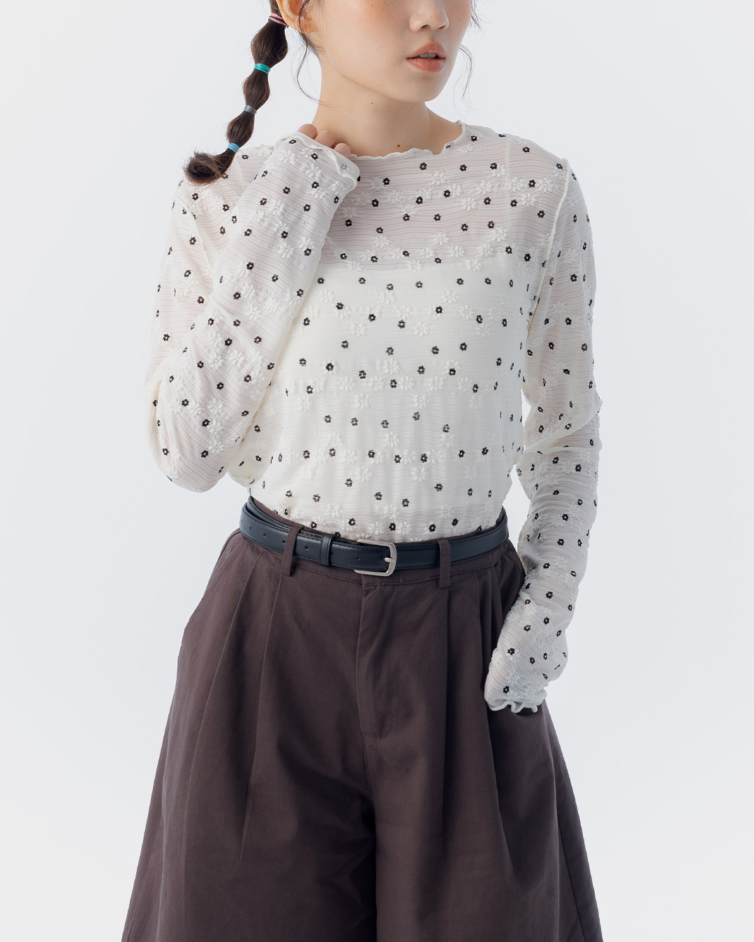 小花木耳邊透膚高領上衣 四色售