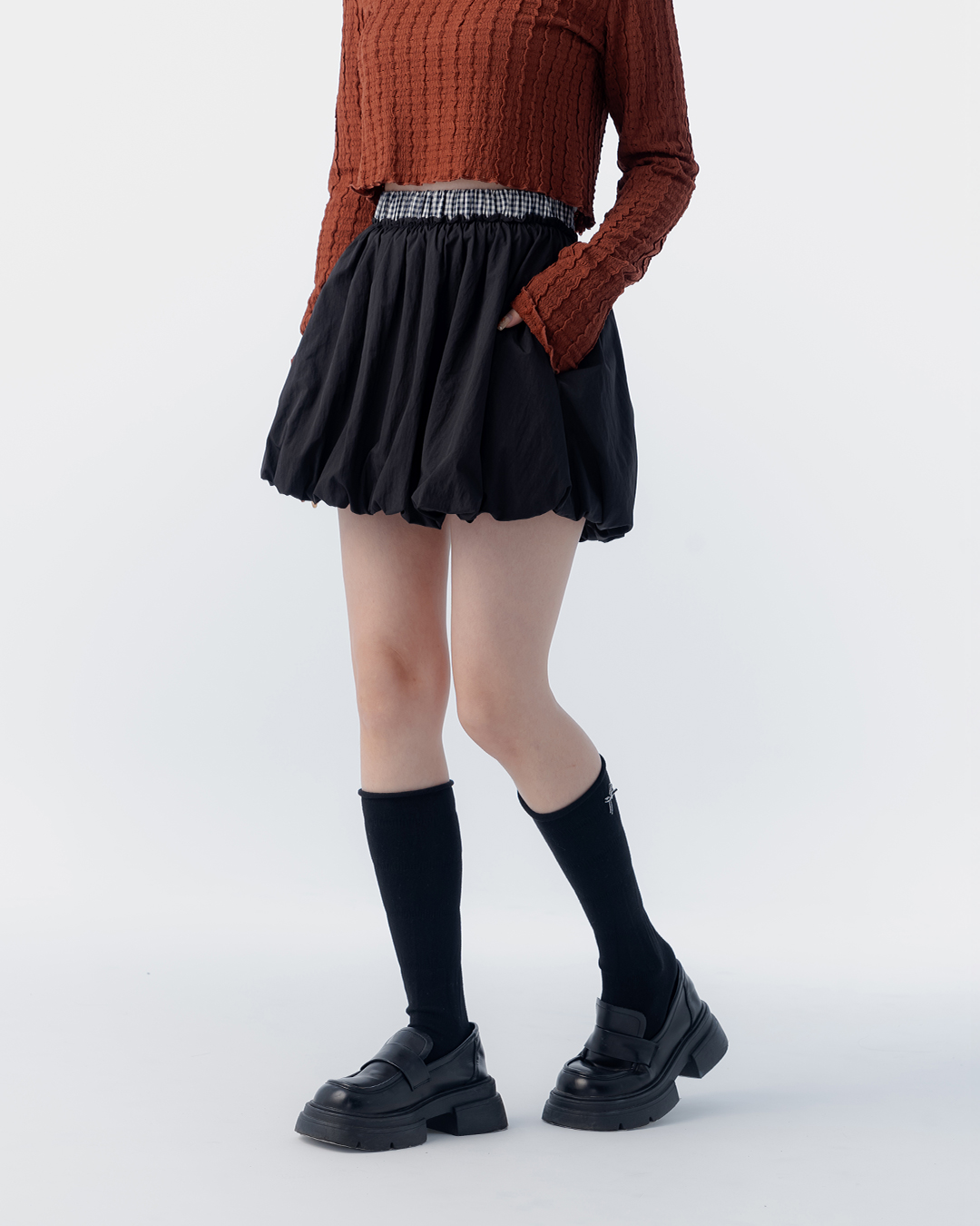 格紋腰頭設計花苞短裙 兩色售 S/M