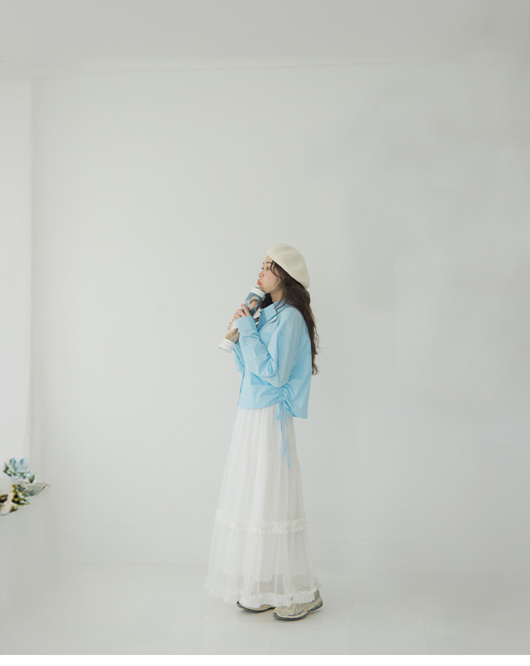 S~L身形實測!分尺寸皺皺木耳邊透膚高領長袖上衣