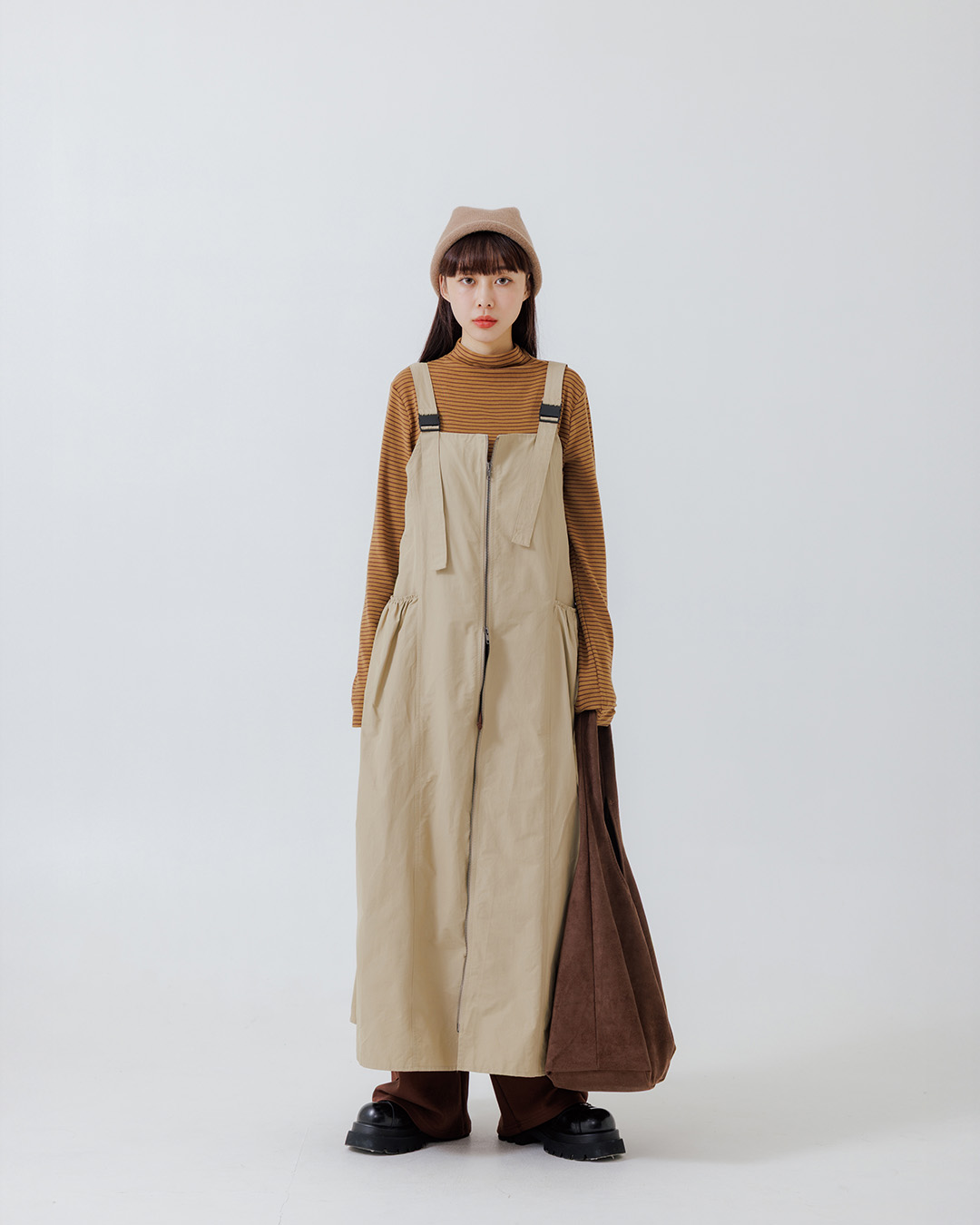 腰抽皺拉鍊工裝吊帶長洋裝 兩色售